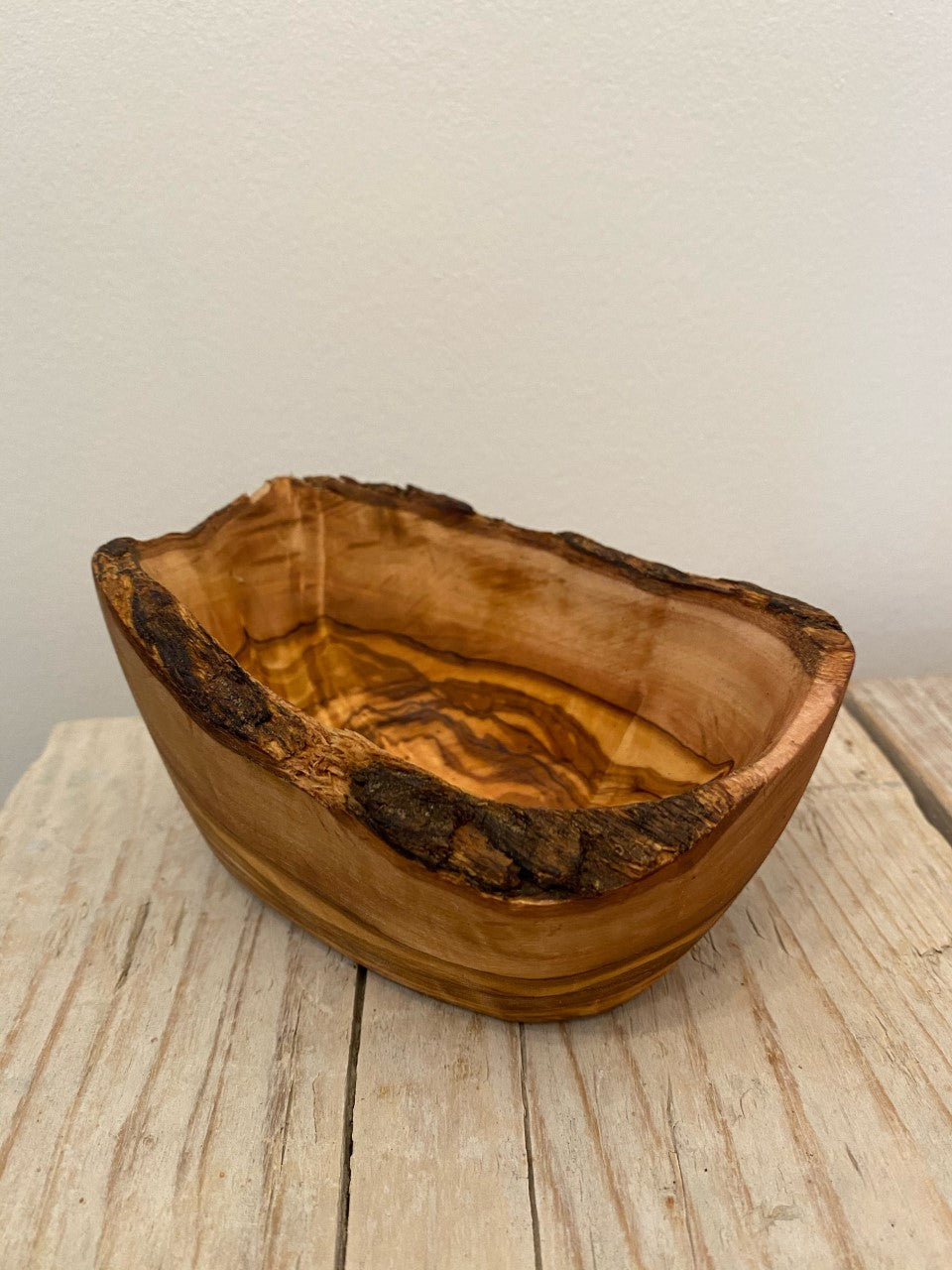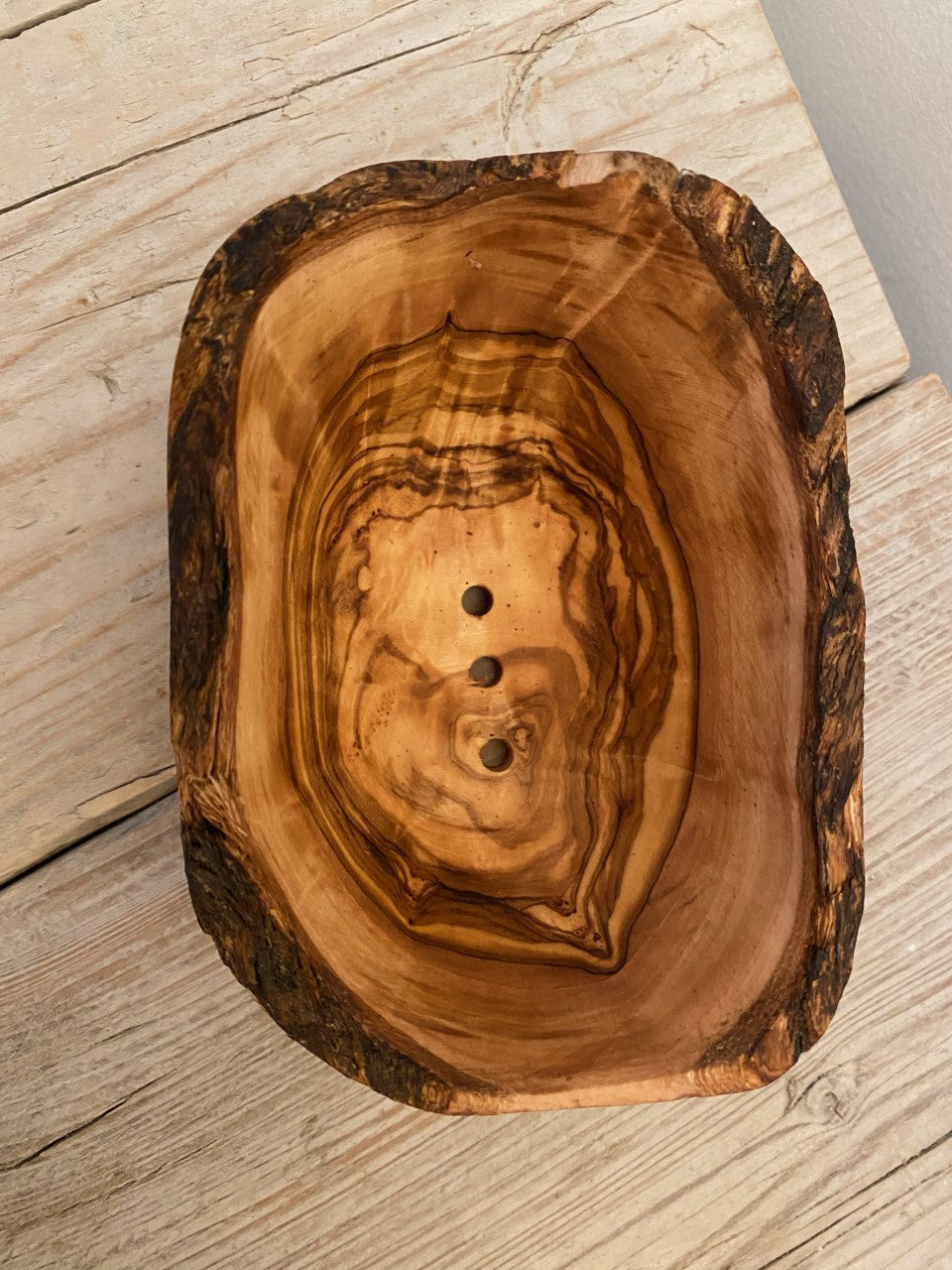 This is a natural olive wood soap dish. Each soap dish is unique as it is hand-carved from a piece of olive wood with each one being unique with unique characteristics.