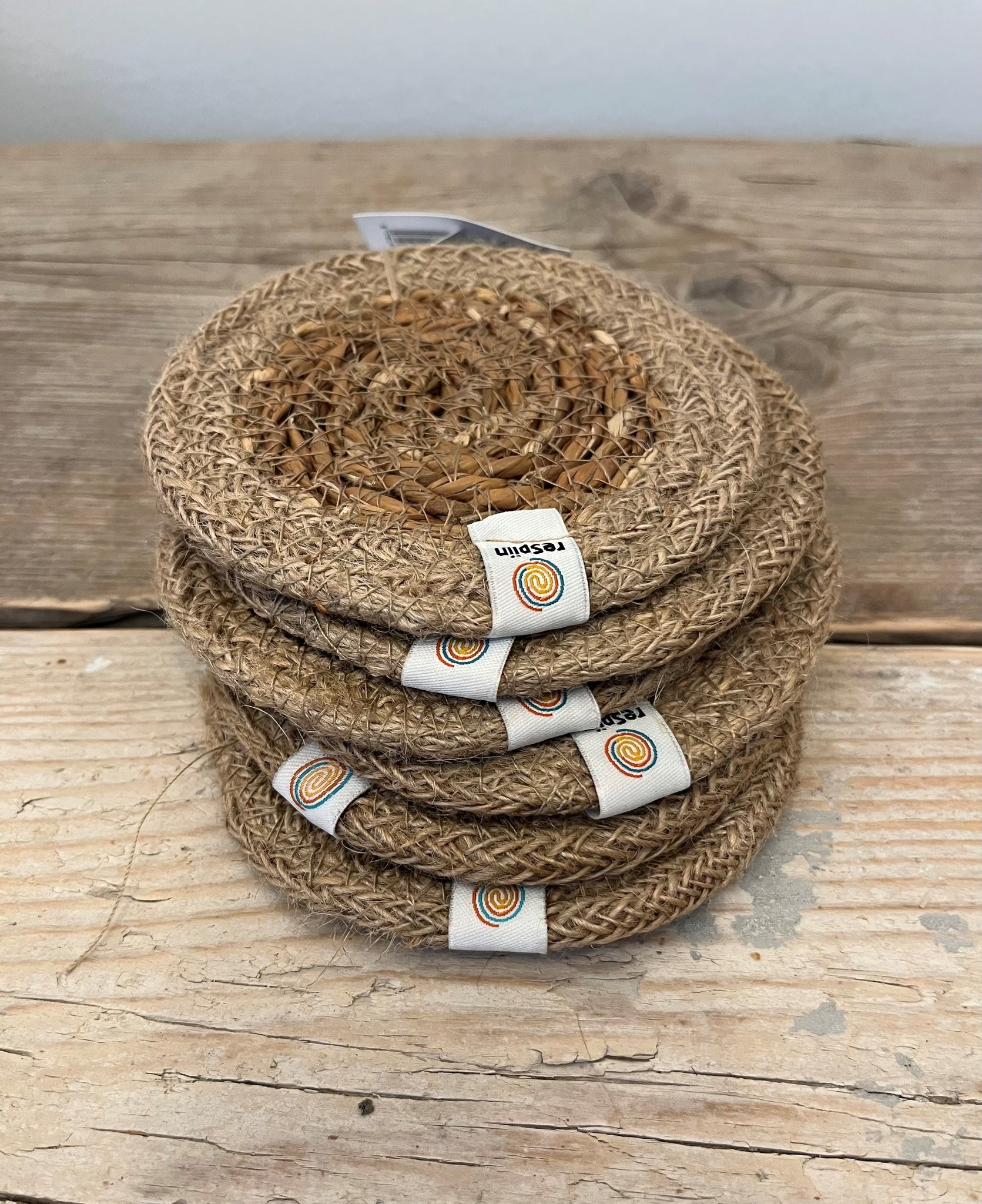 A round coaster made from woven seagrass with a natural jute rim around the outside.